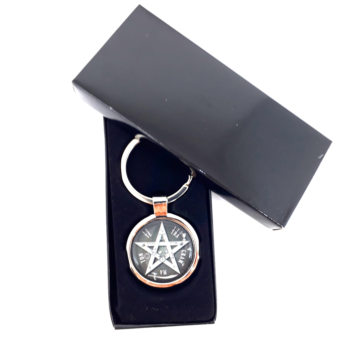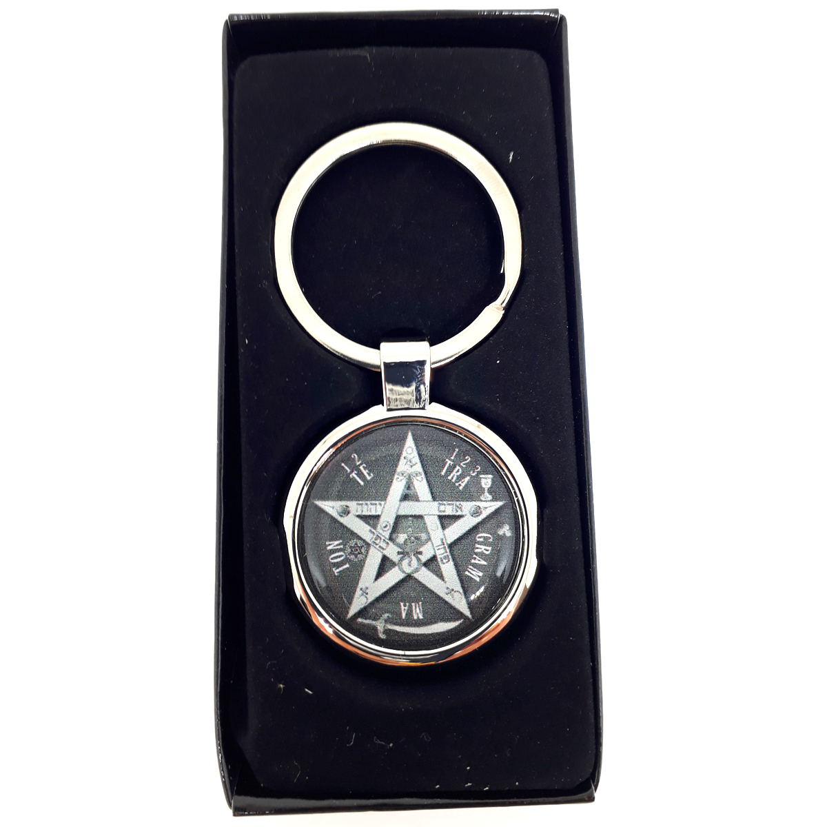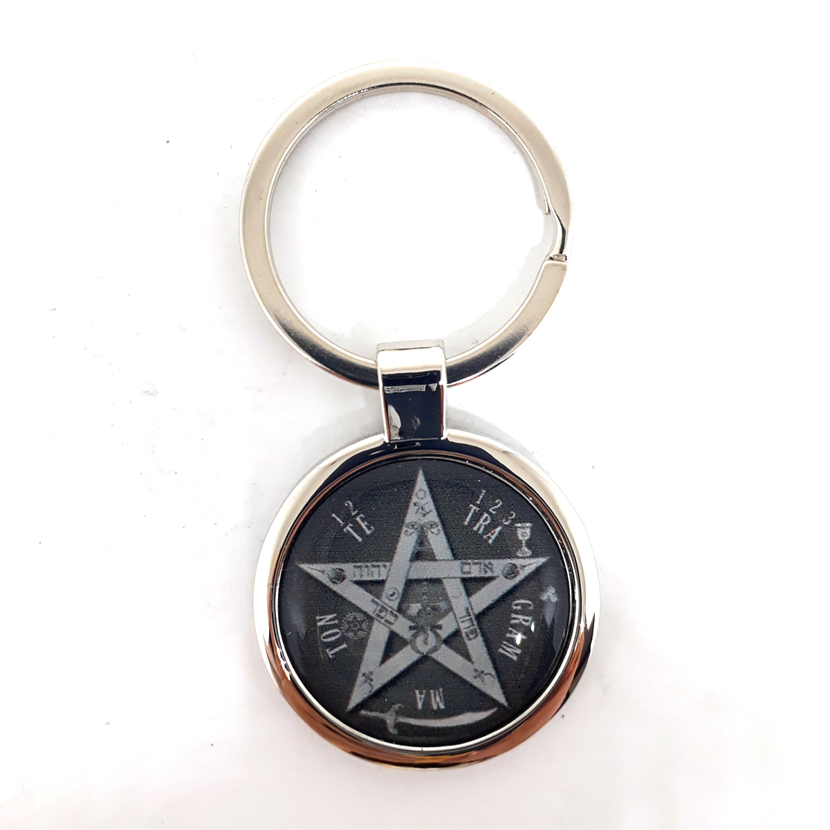 Chaveiro com o símbolo “Tetragrammaton Preto e Branco” feito especialmente para você.
