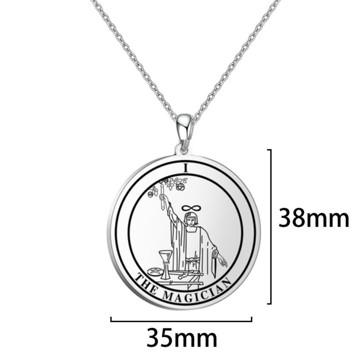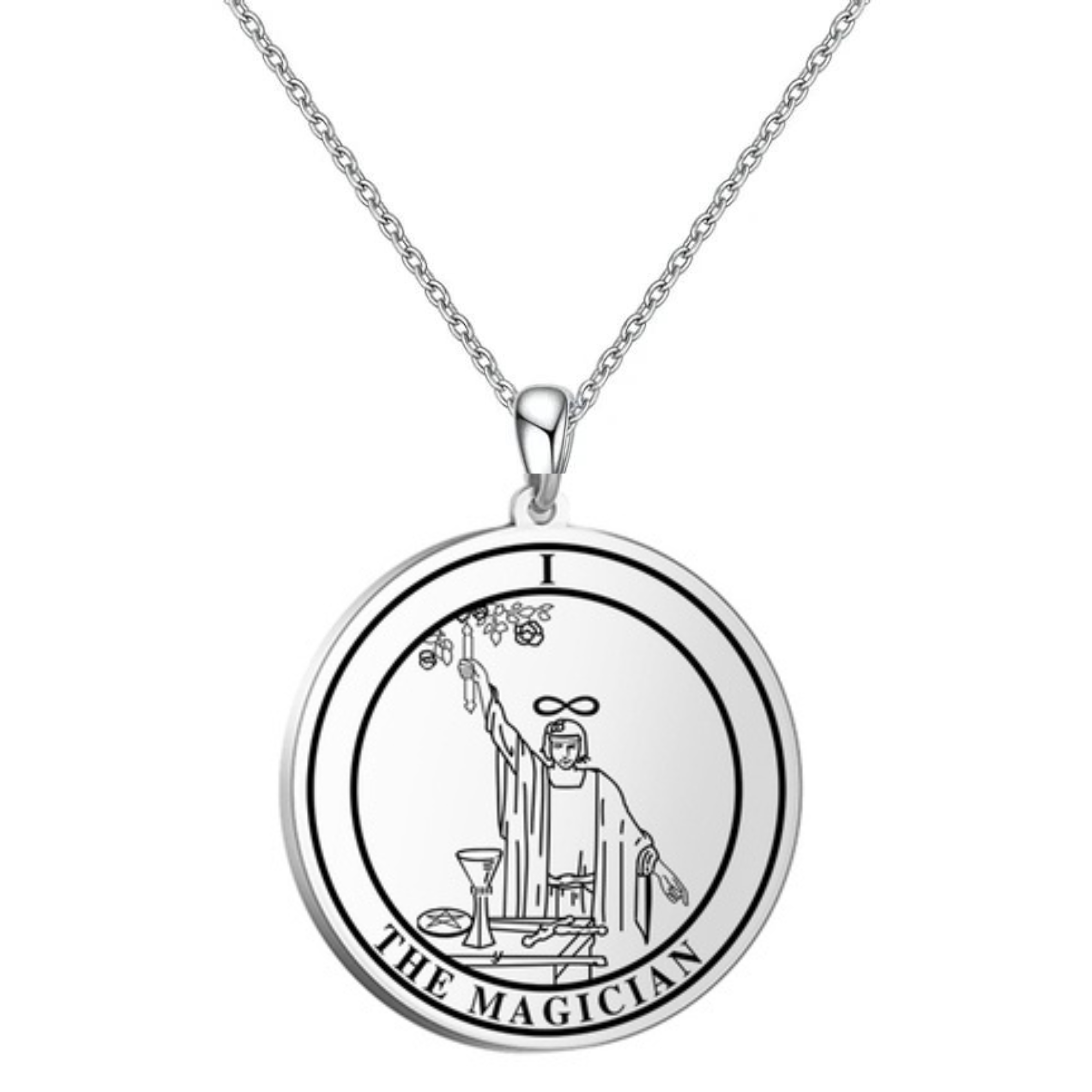 Colar e Pingente (redondo) na cor prata com o símbolo da Lâmina I do Tarô de Marselha, O Mago.